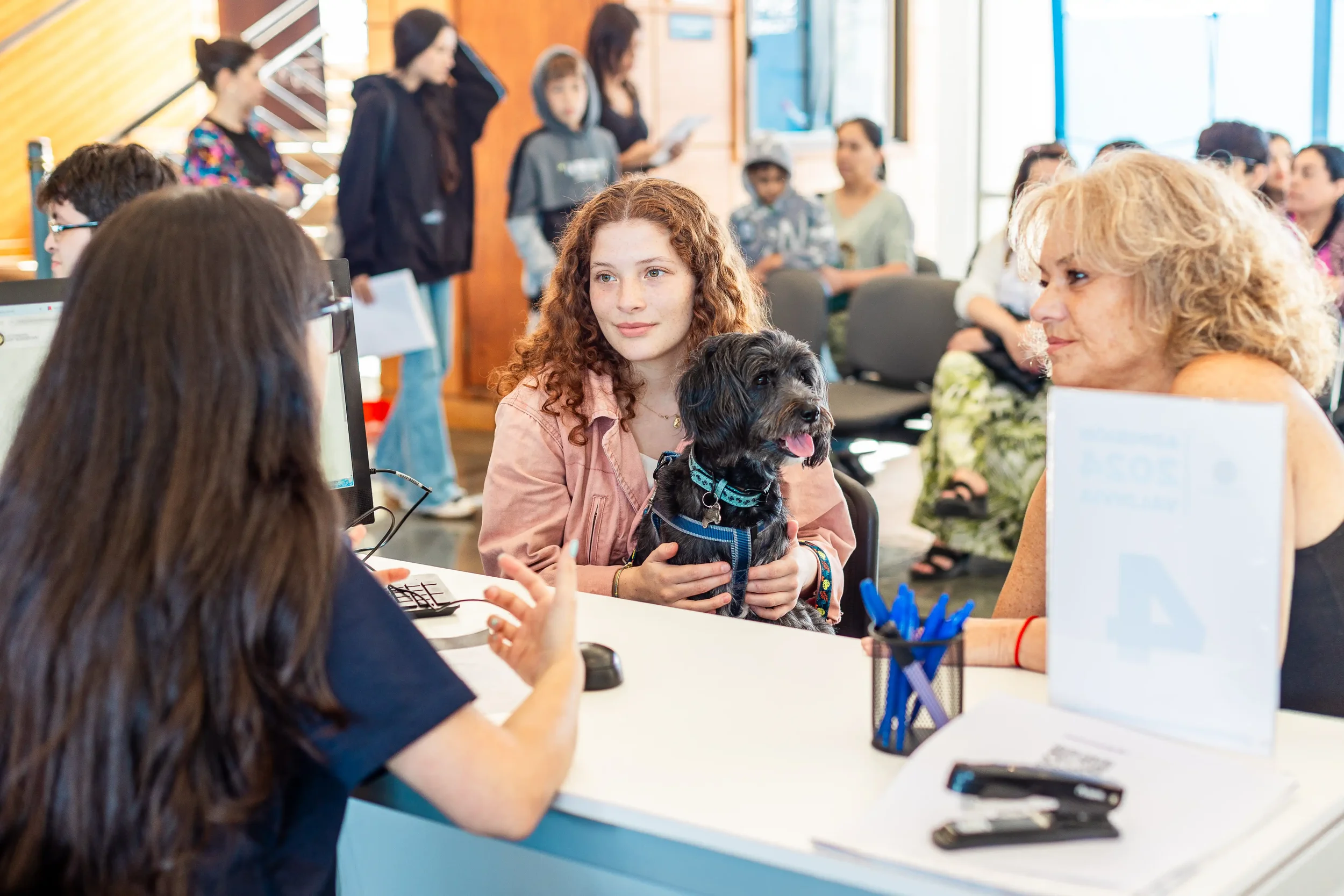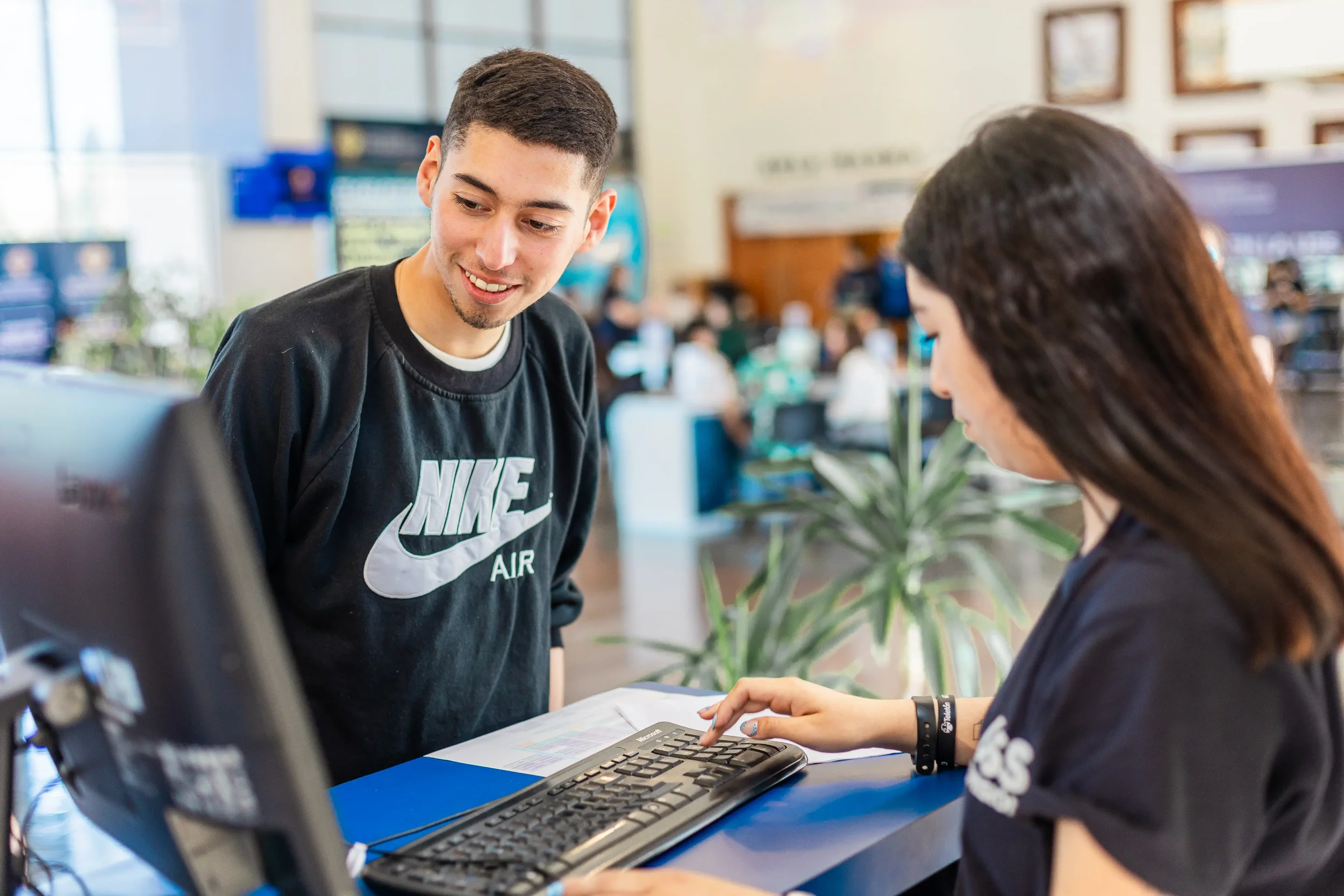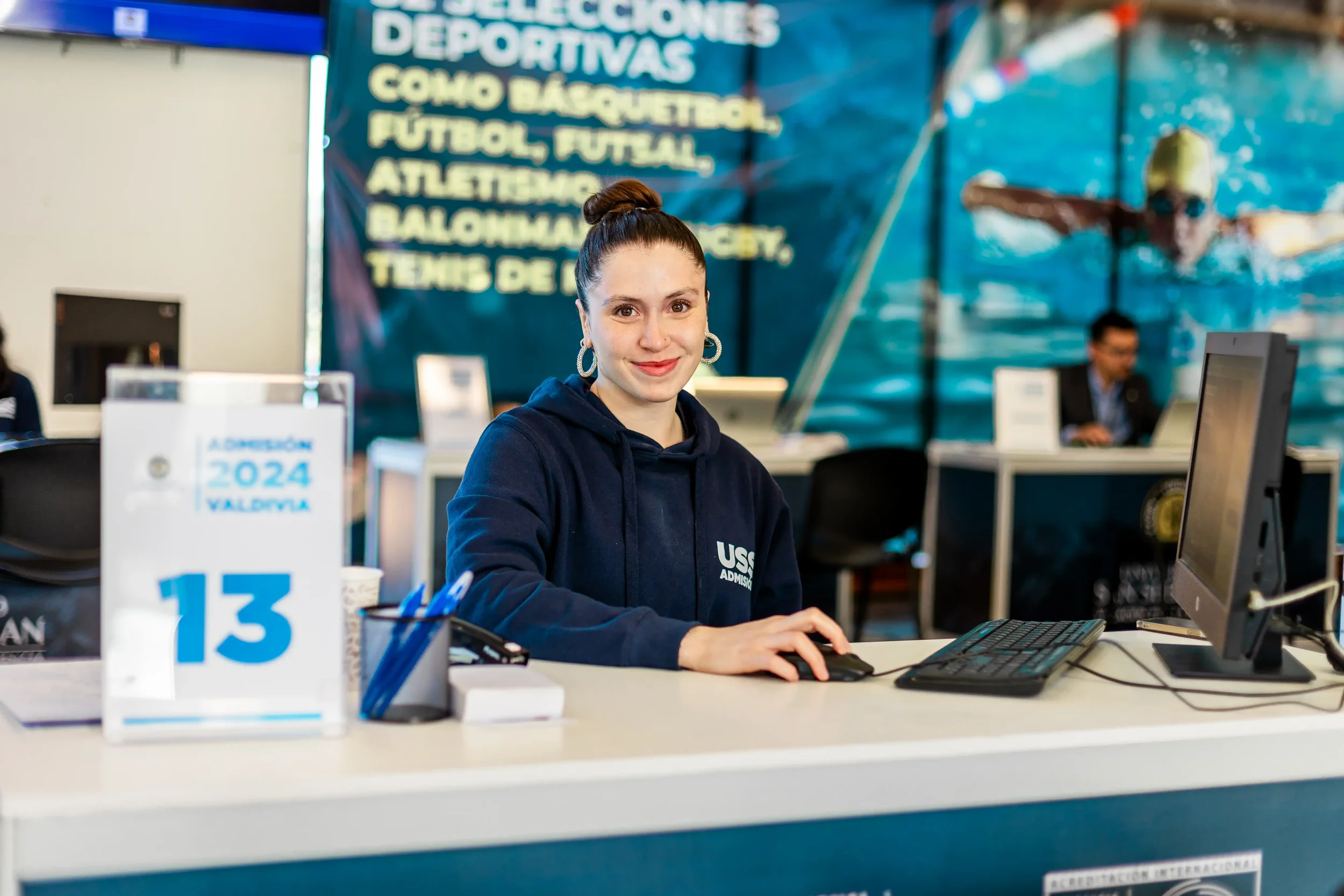 Joven en mostrador de admisiones en una oficina institucional, con fondo de banner deportivo y otros empleados en el área.