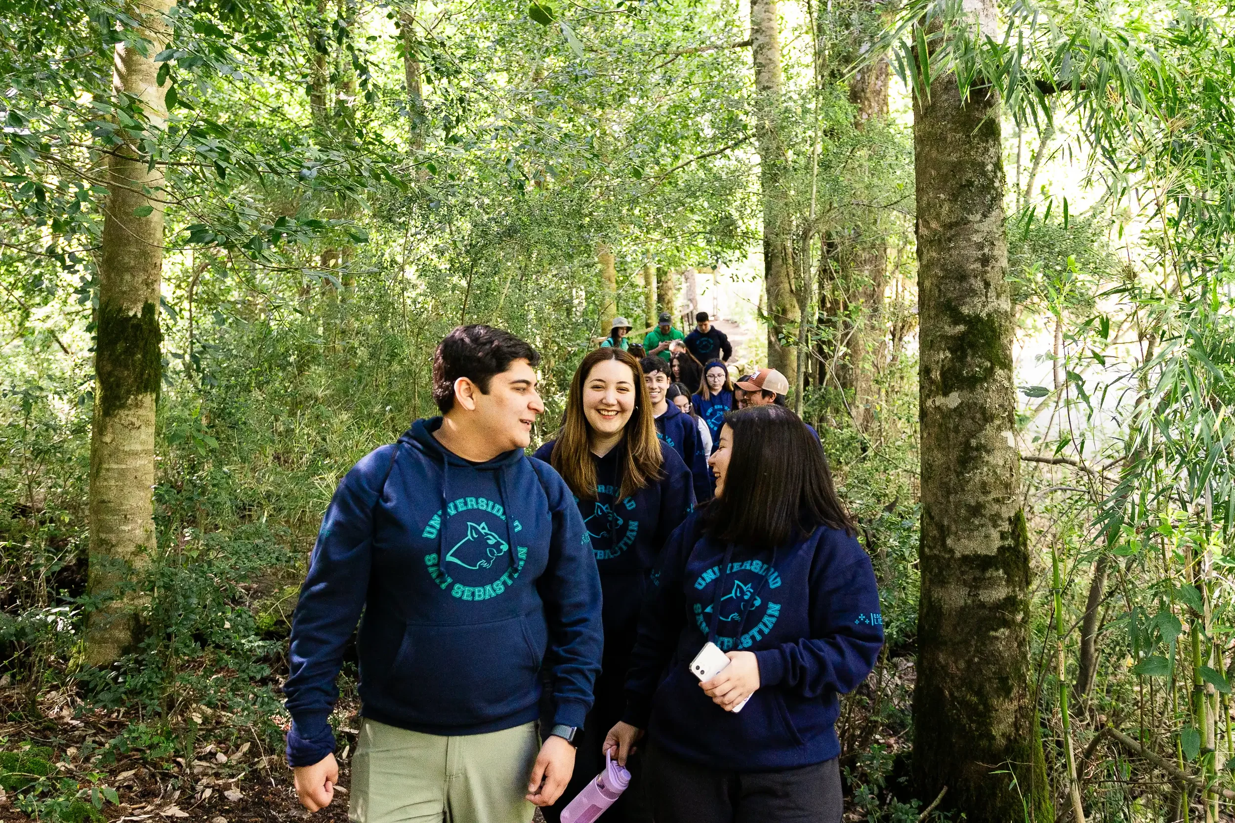 Grupo de estudiantes caminando por un bosque, charlando y sonriendo.
