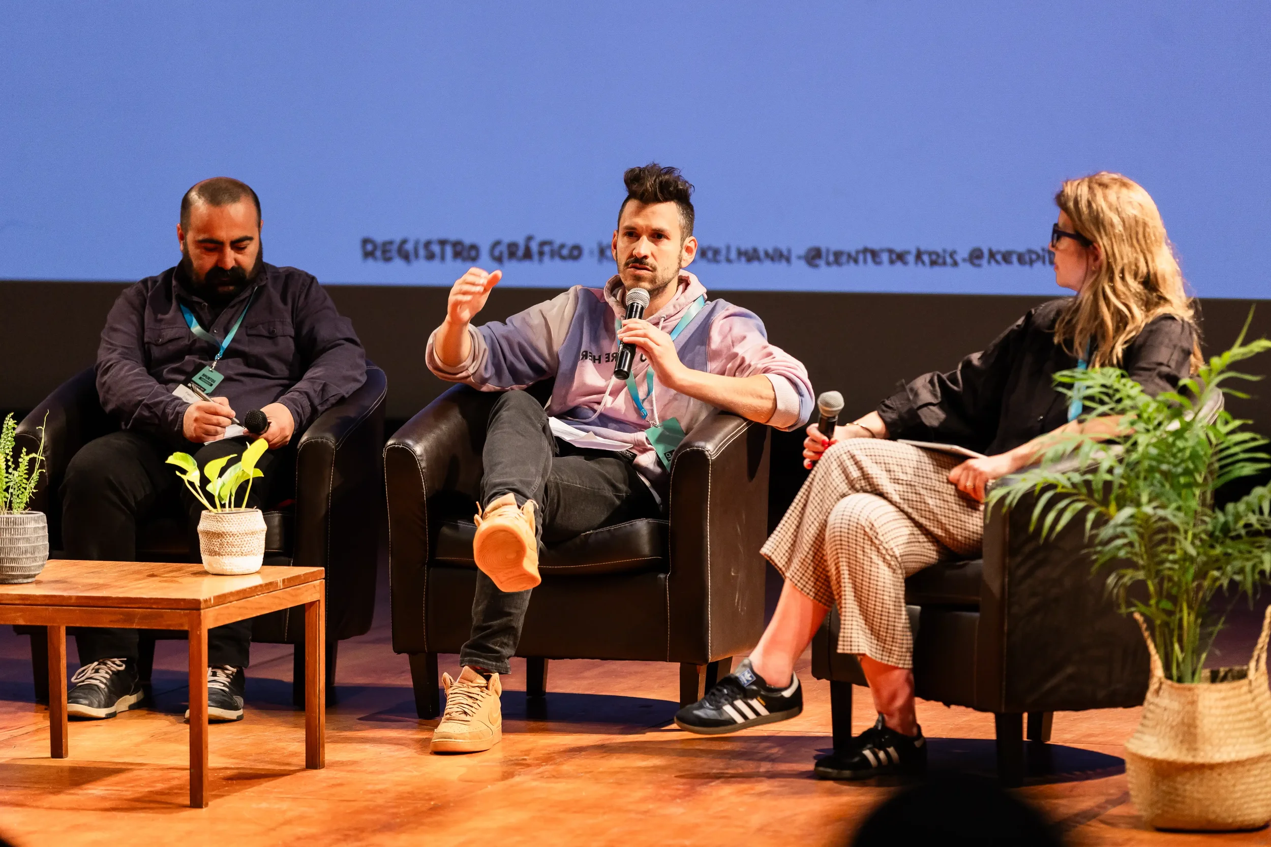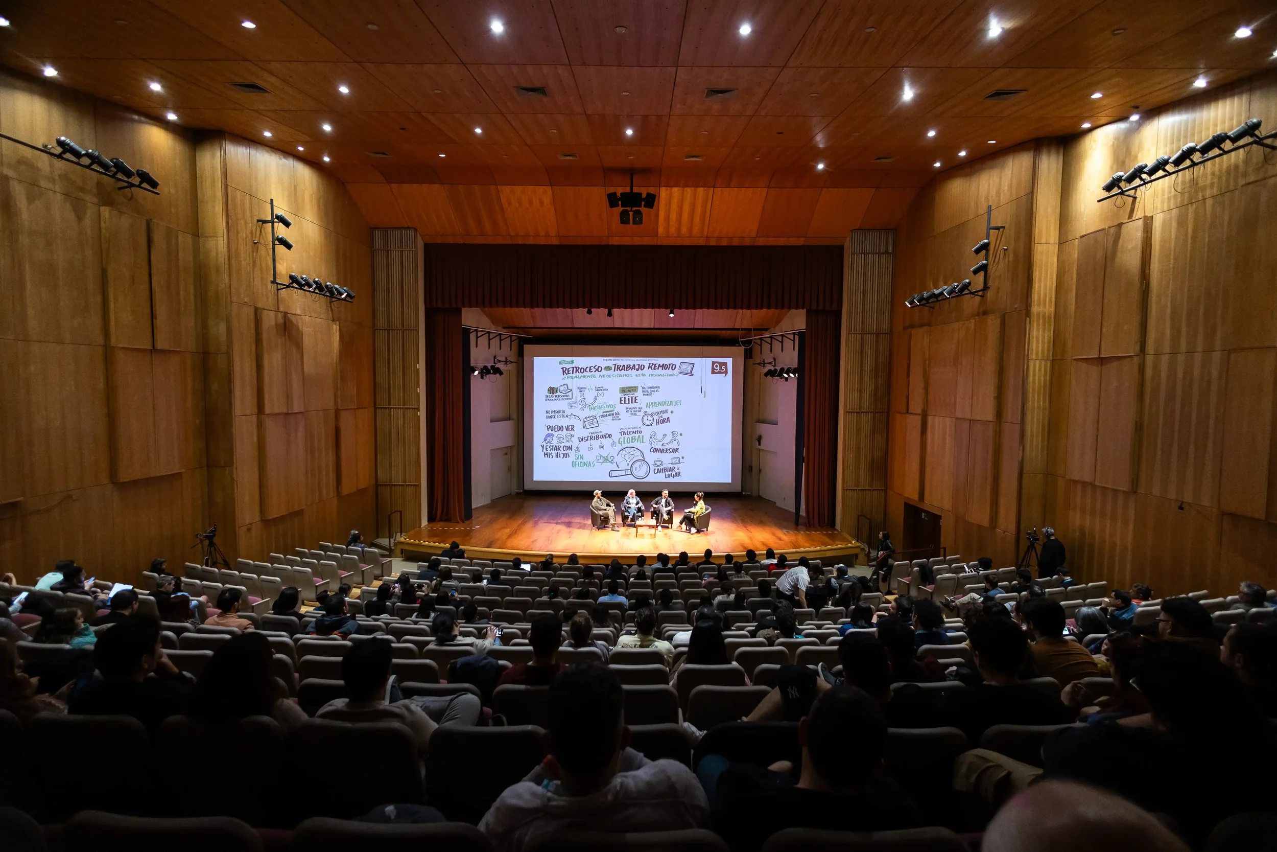 Auditorio con muchas personas y en el escenario tres panelistas en una mesa, pantallas con escritura y dibujo a color en el fondo.