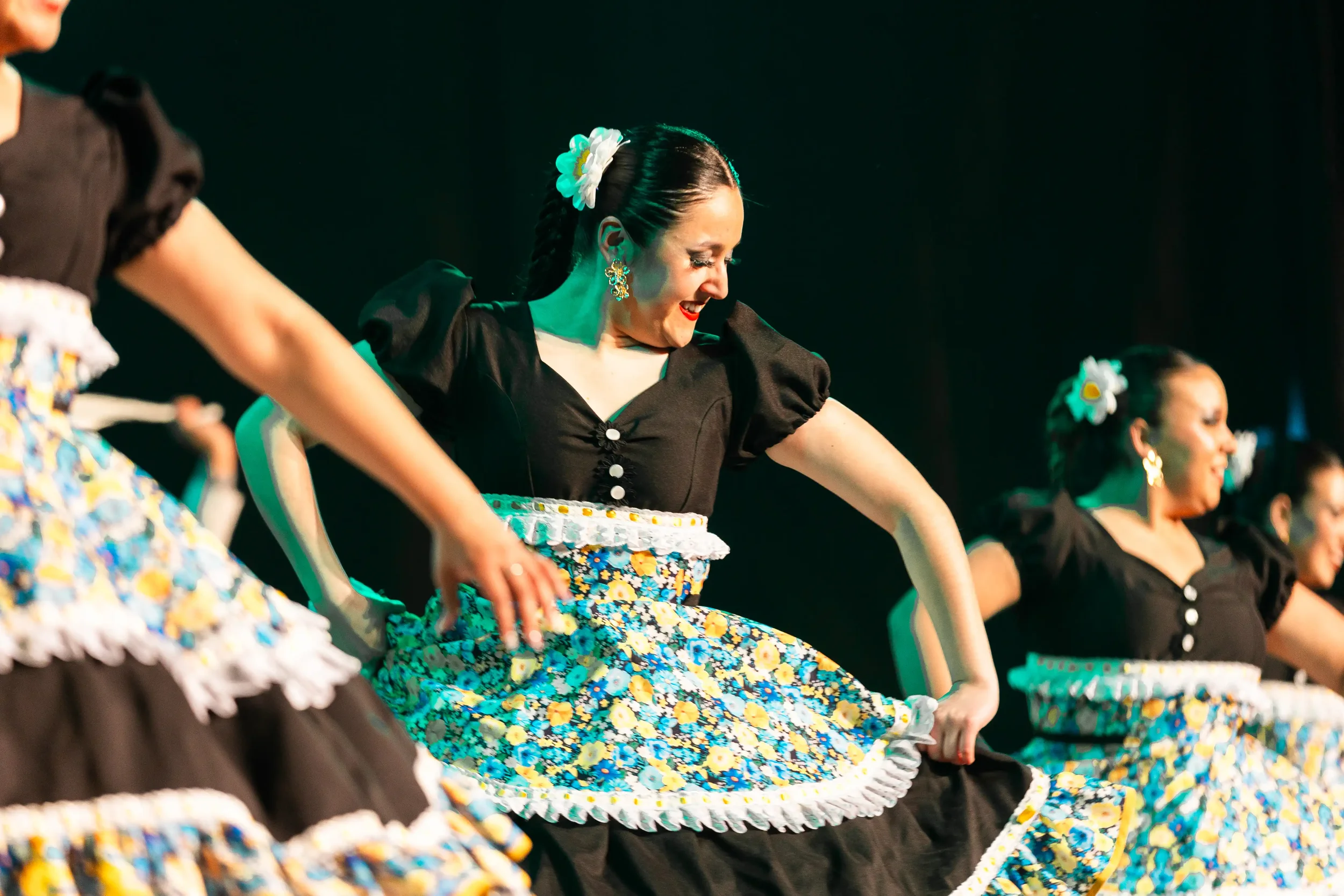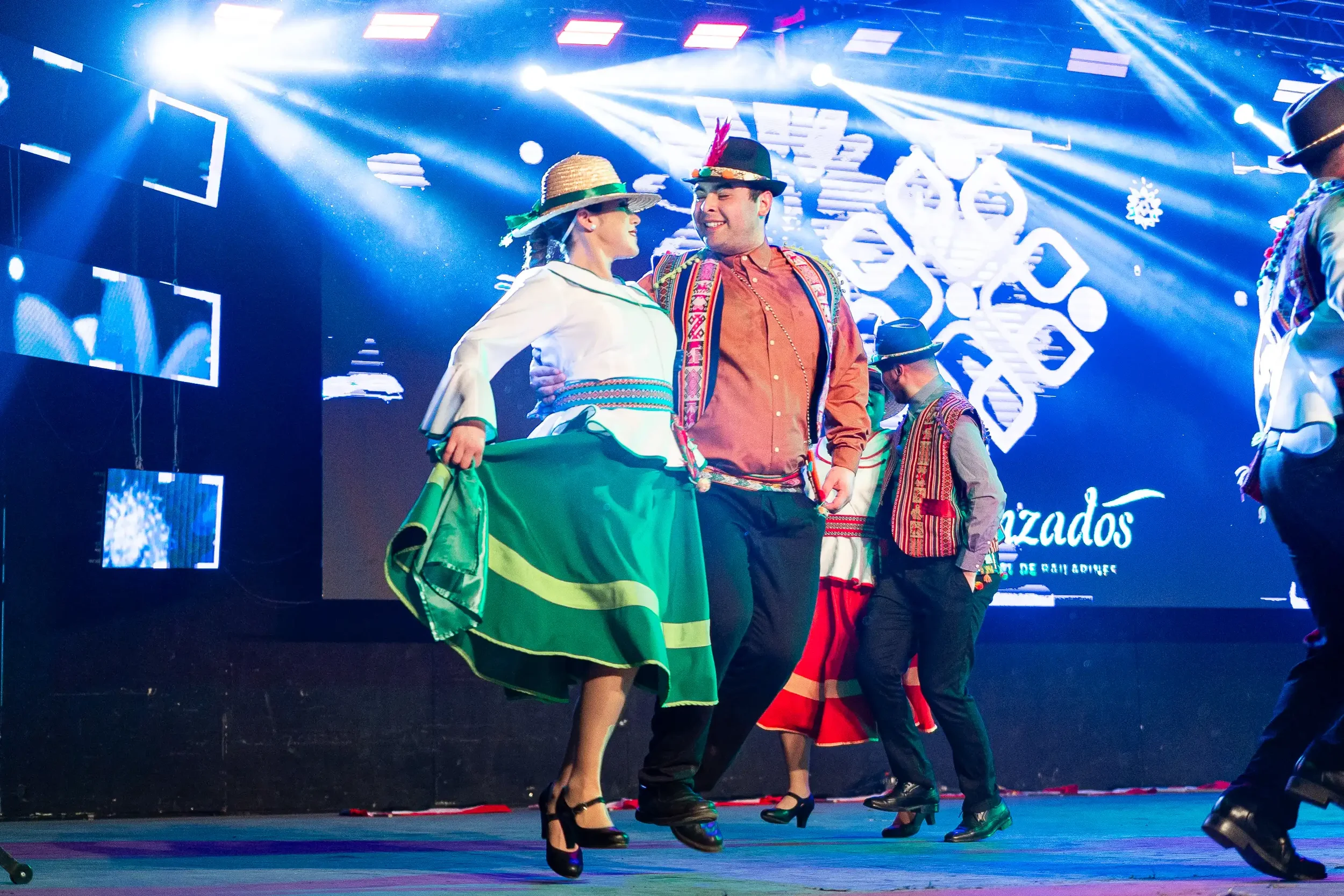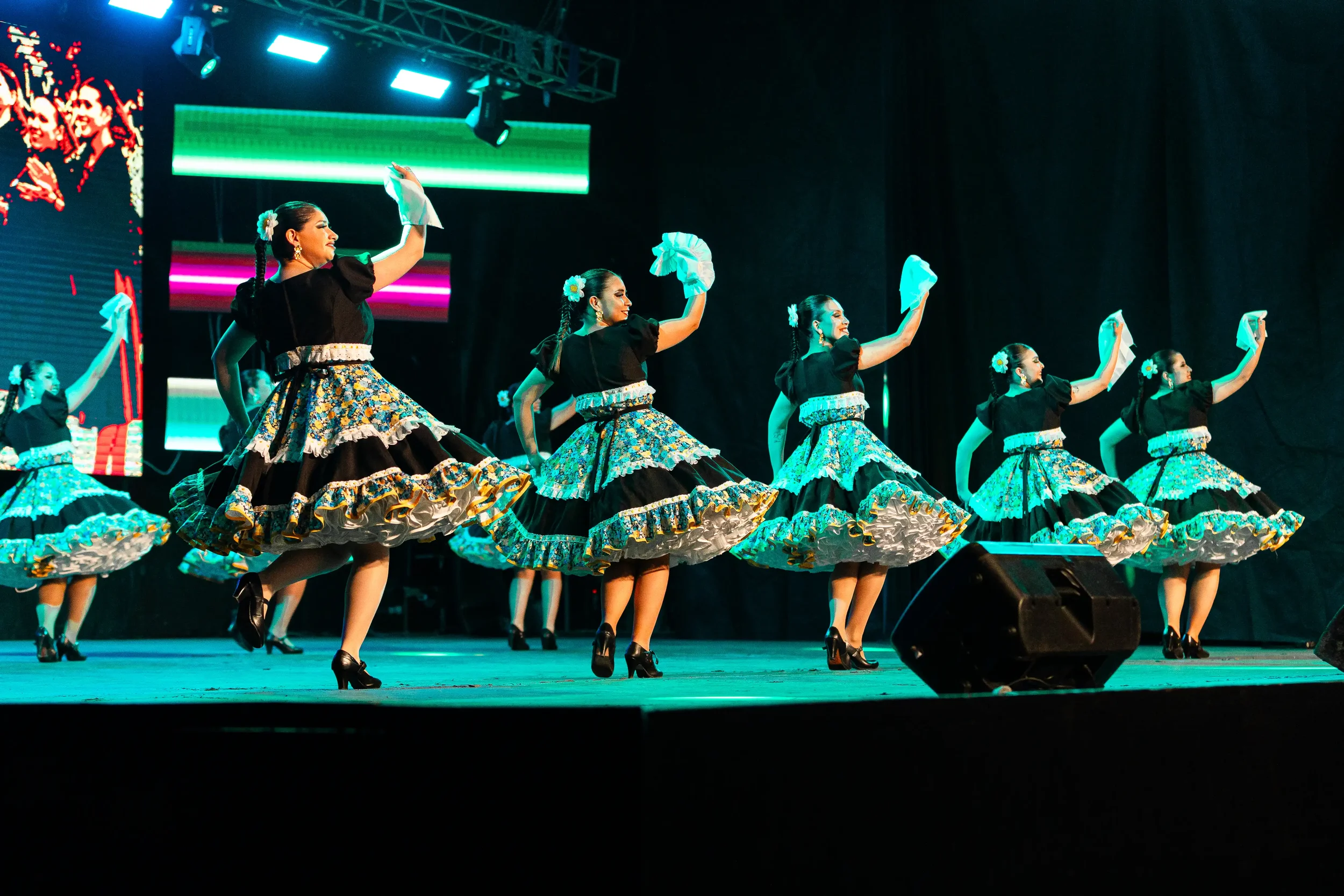 Personas bailando en una presentación con trajes tradicionales latinoamericanos, en un escenario con iluminación y fondo decorativo