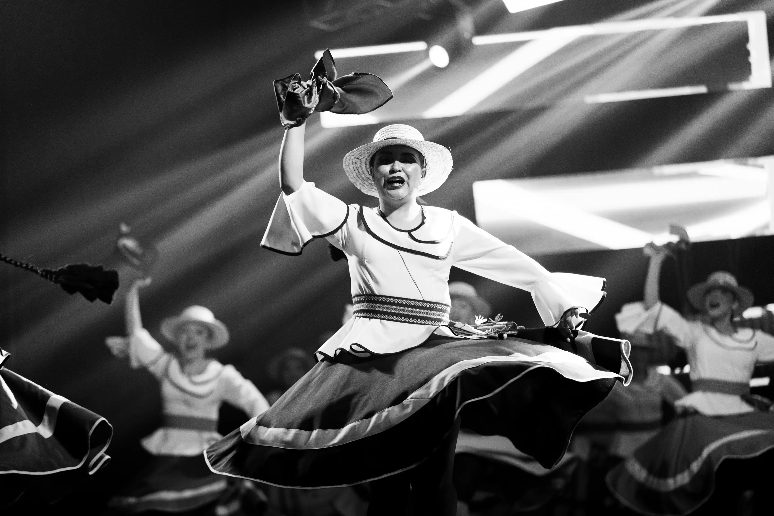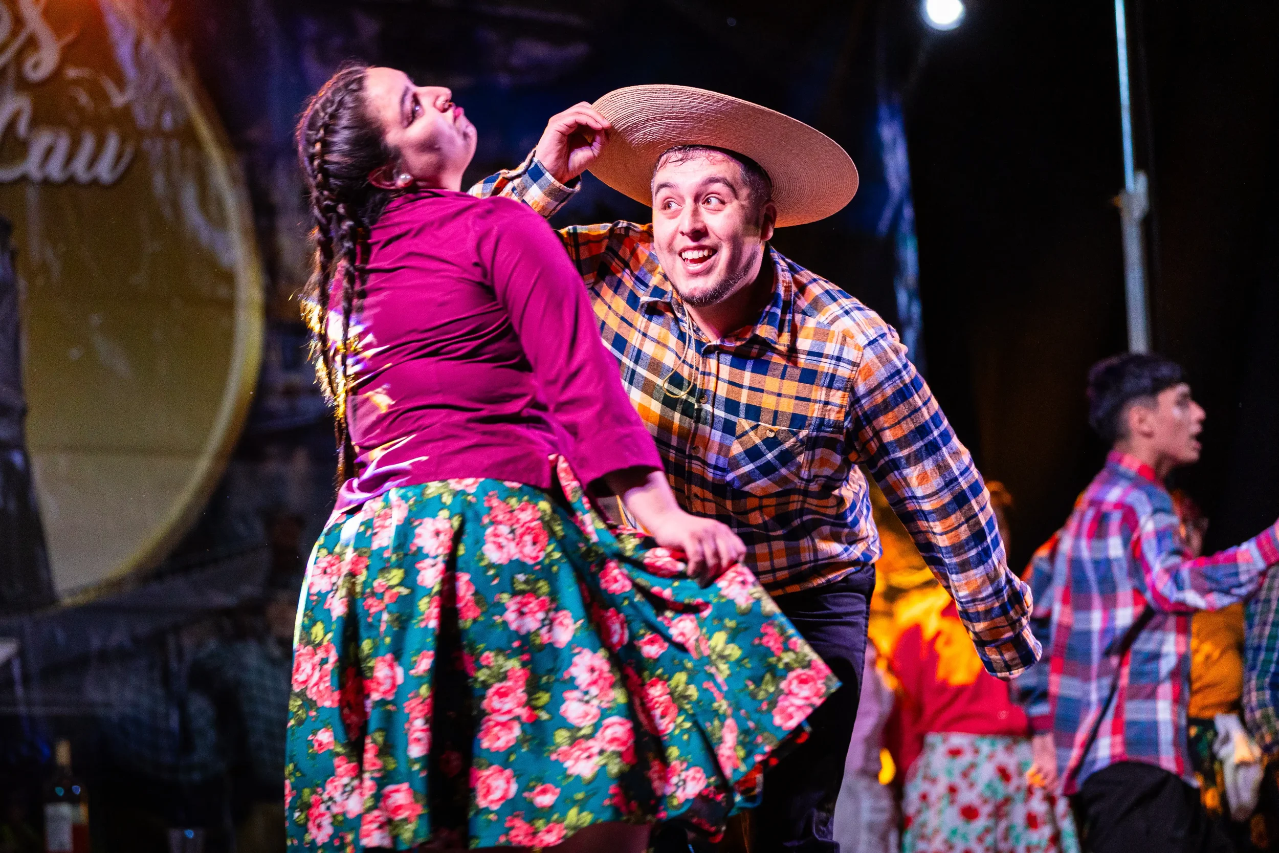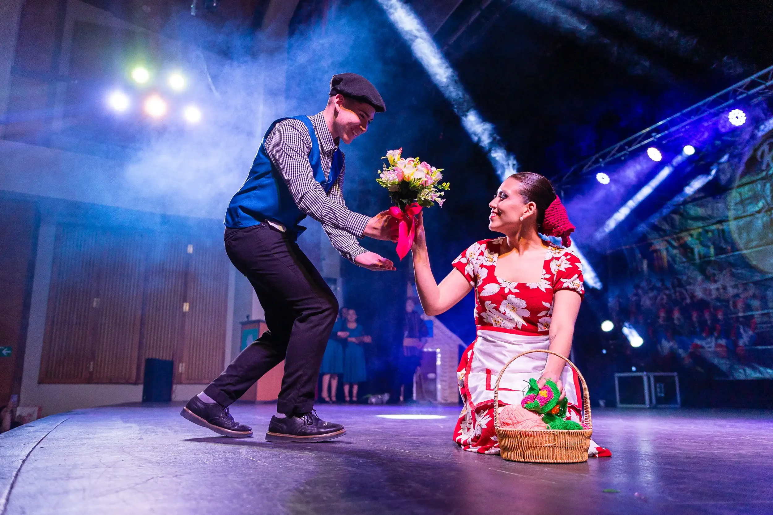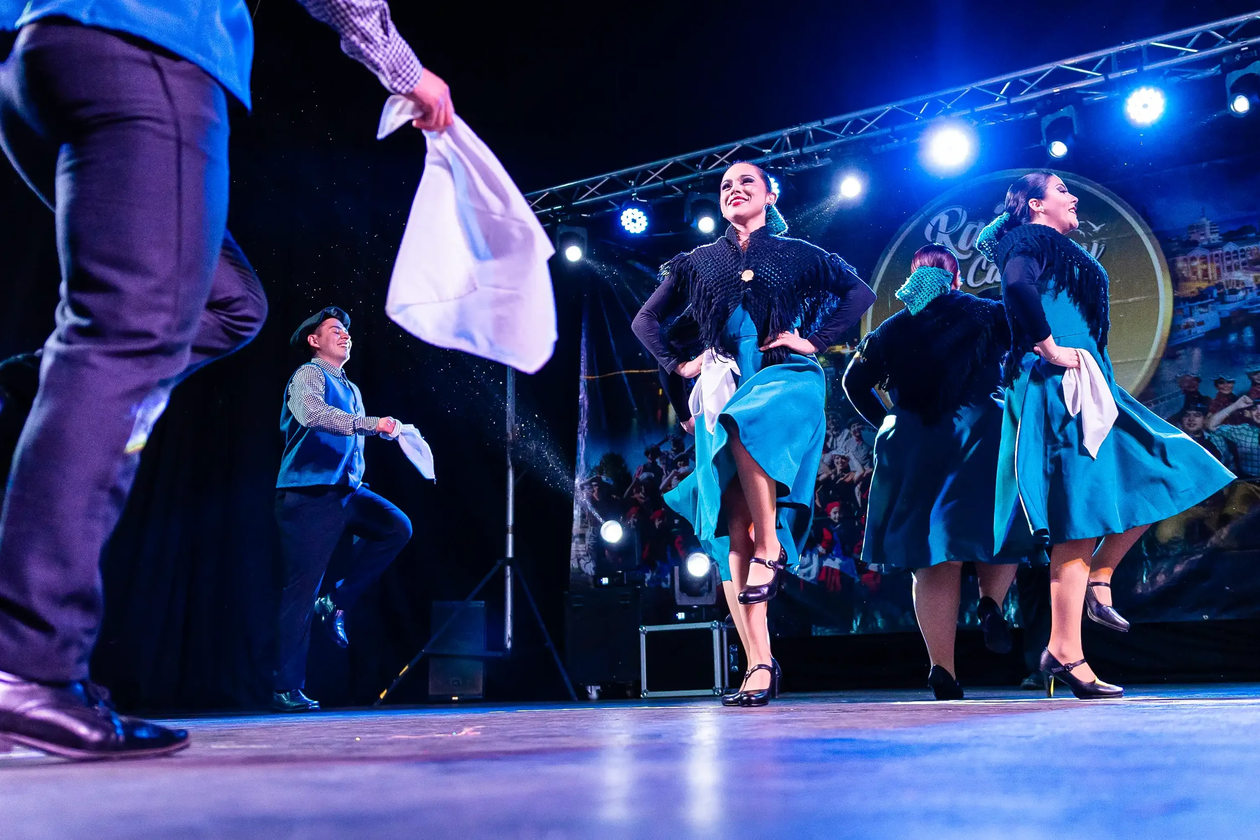 Personas bailando en una presentación con trajes tradicionales latinoamericanos, en un escenario con iluminación y fondo decorativo