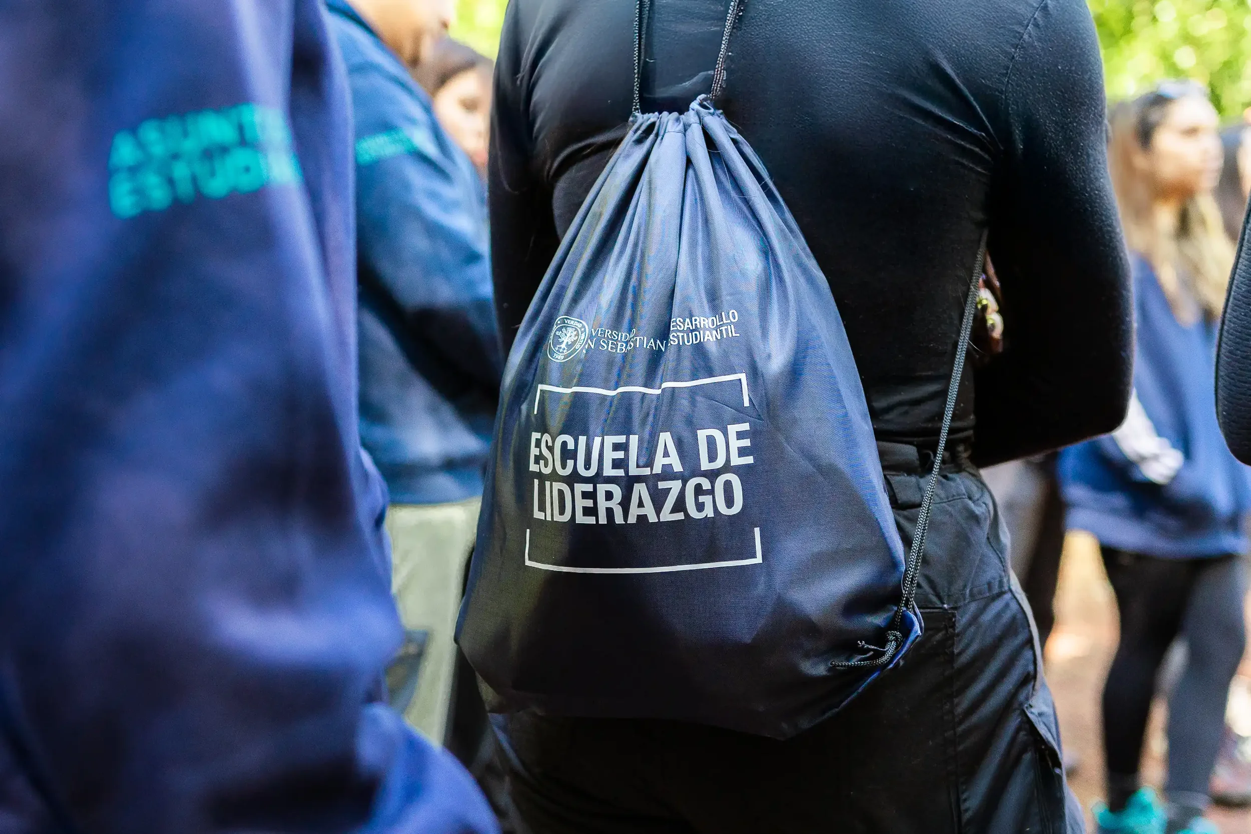 Persona con mochila que tiene el texto "Escuela de Liderazgo" impreso, en un evento al aire libre con varias personas.