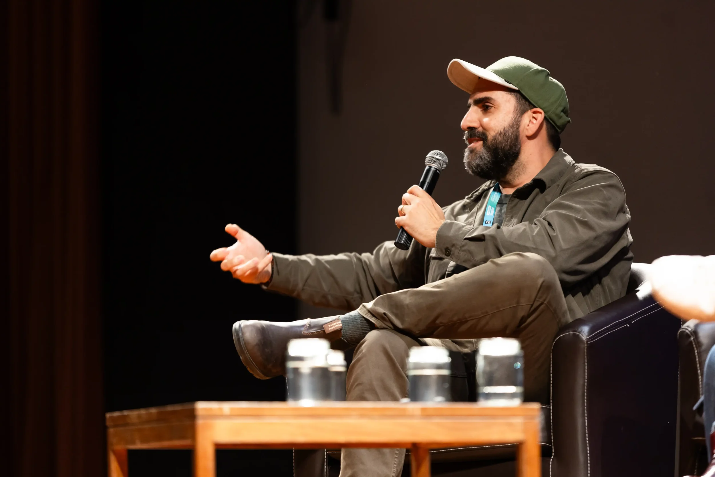 Hombre con barba, gorra y ropa de campo, sentado en un sillón negro, sosteniendo un micrófono y hablando en una conferencia o panel. En una mesa al frente, hay varios vasos de agua.