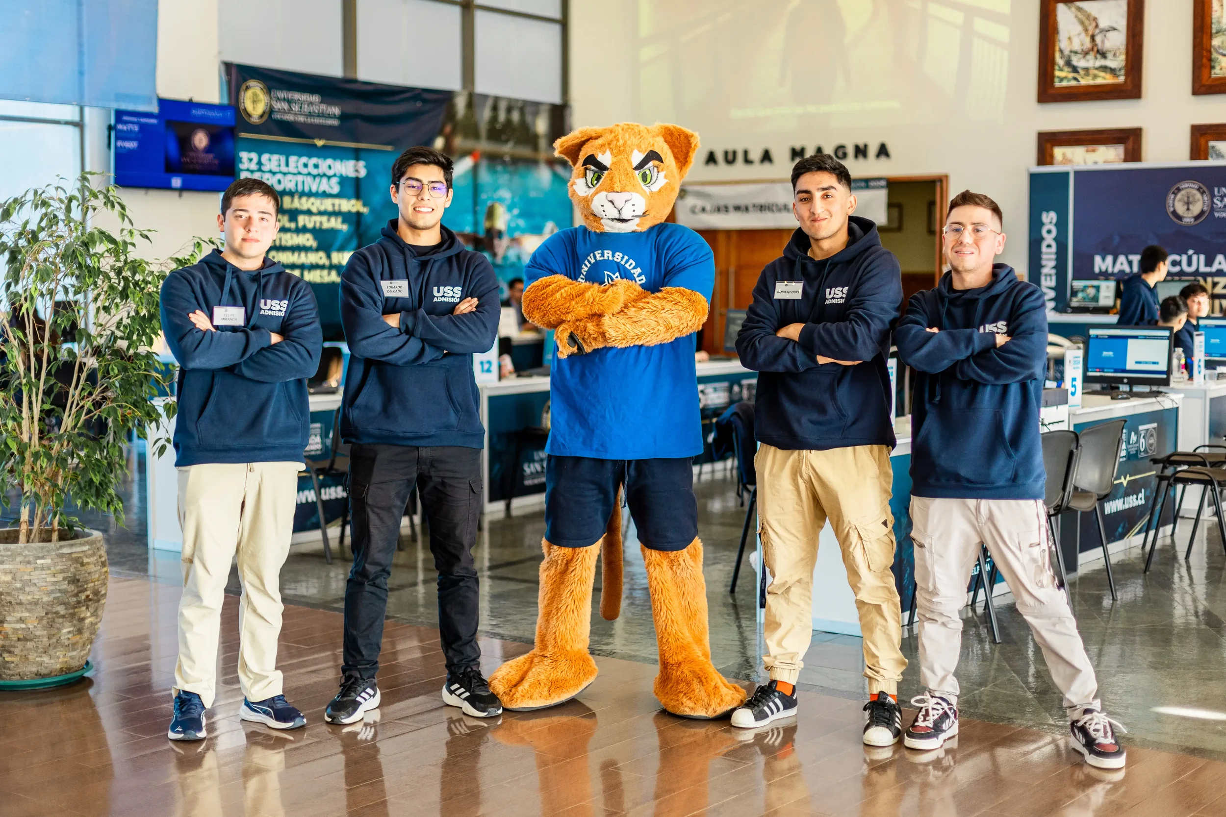 Cinco personas, entre ellas un alumno disfrazado de mascota de un león, en un ambiente de universidad con computadoras y señalización en el fondo, todos con ropa casual y levantando los brazos en señal de orgullo o celebración.