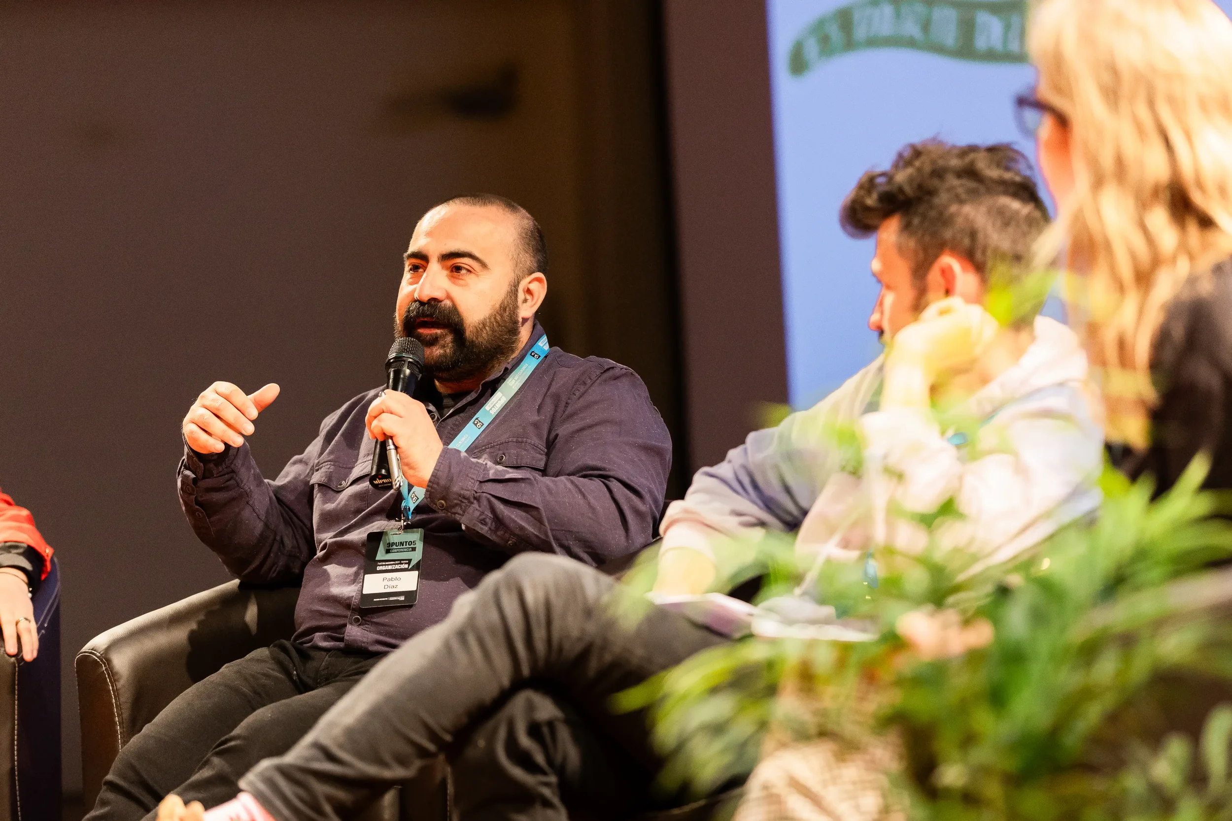 Hombre con barba y camiseta oscura hablando con micrófono en una mesa de panel de discusión, acompañado por otros jóvenes y decorado con plantas, en un evento conference.