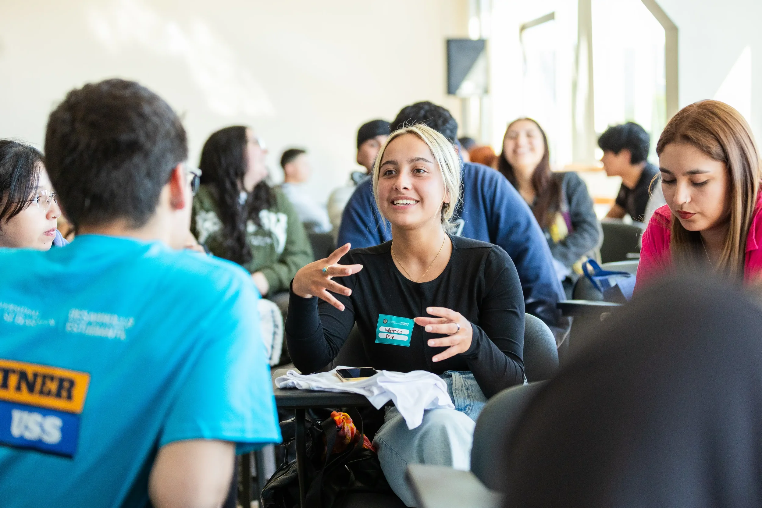 Grupo de jóvenes conversando en una sala de clases o seminario, algunos tomando notas, en un ambiente brillante y colaborativo.