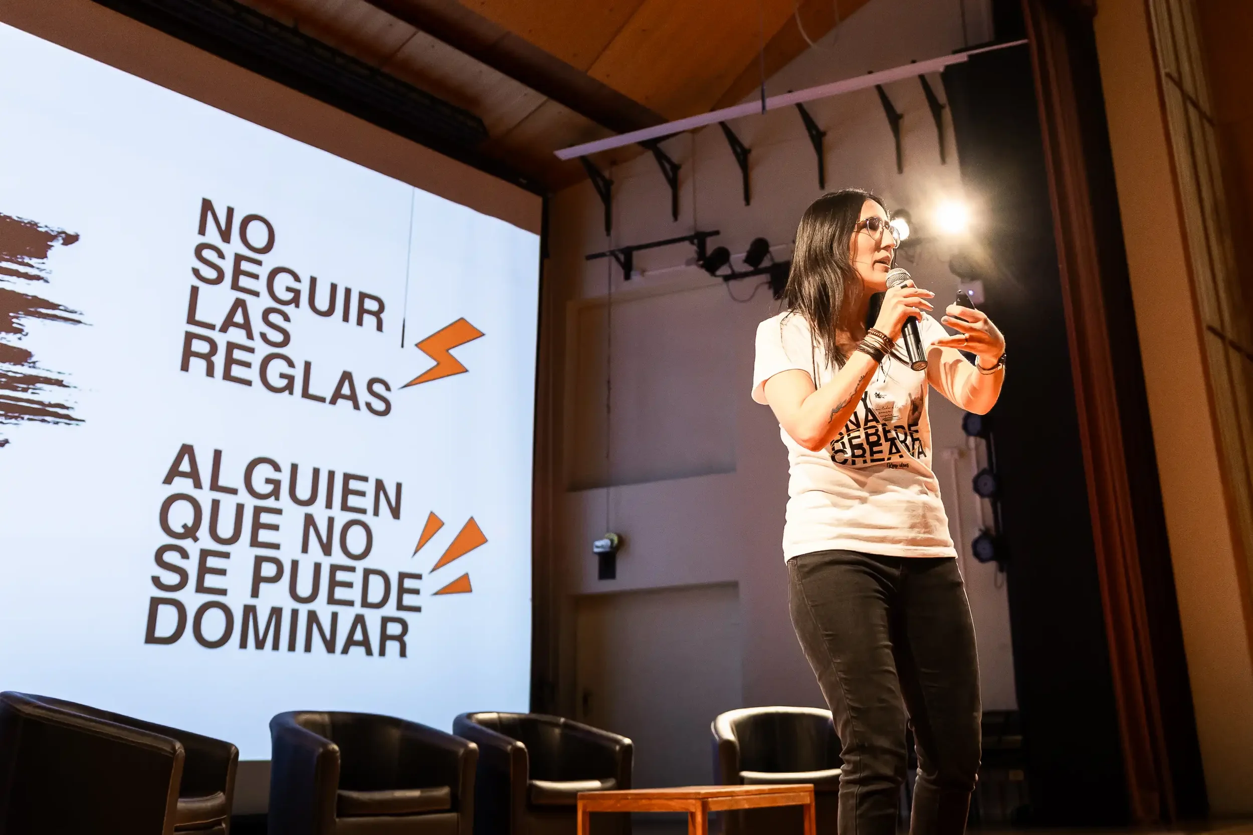 Mujer de cabello oscuro, gafas y camiseta blanca, hablando en un escenario con micrófono en la mano frente a una diapositiva que dice: 'No seguir las reglas. Alguien que no se puede dominar'.