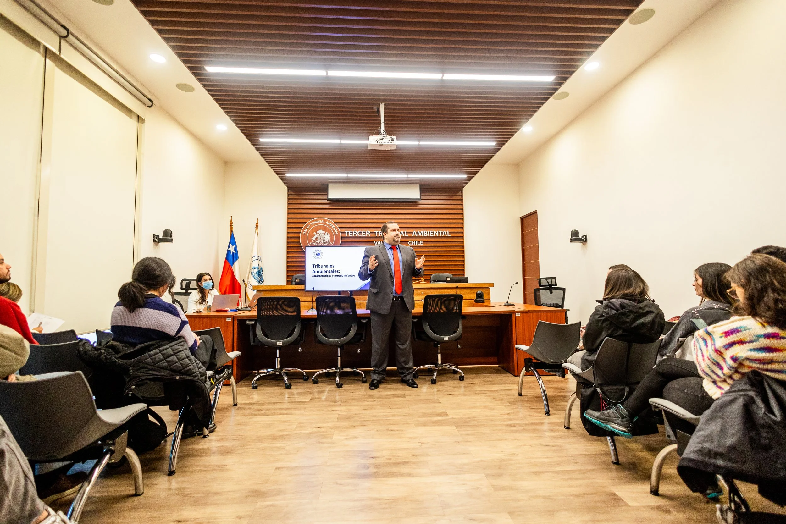 Hombre de traje y corbata dando una presentación frente a un grupo en una sala de conferencias con bandera de Chile y bandera institucional, en un entorno formal.