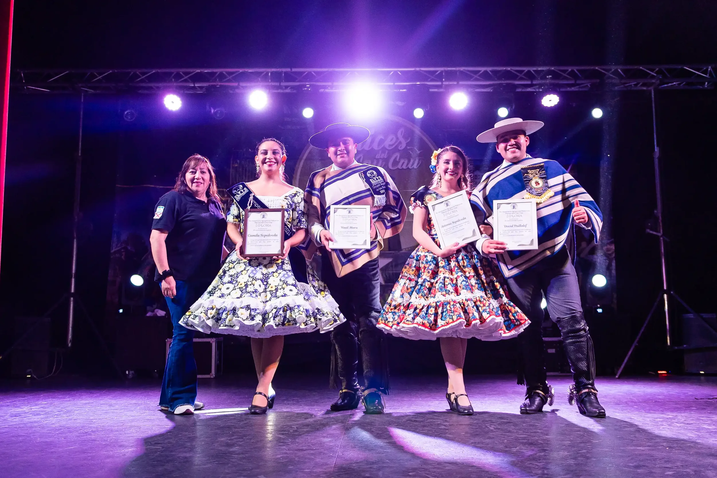 Cinco personas en un escenario, con dos mujeres con trajes tradicionales y tres con ropa de folklor, sosteniendo certificados de reconocimiento; fondo con luces y cartel que dice 'Reyes del Cau'.