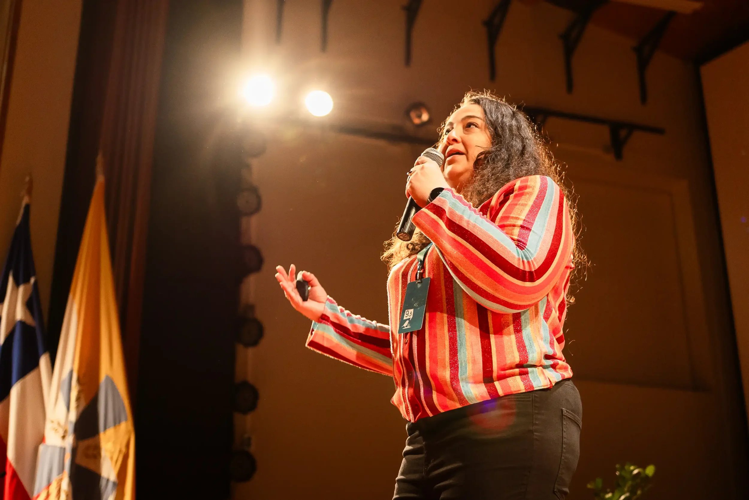 Una mujer con cabello rizado y camiseta a rayas rojas, naranjas, azules, y blancas, sosteniendo un micrófono en un escenario, con banderas al fondo.