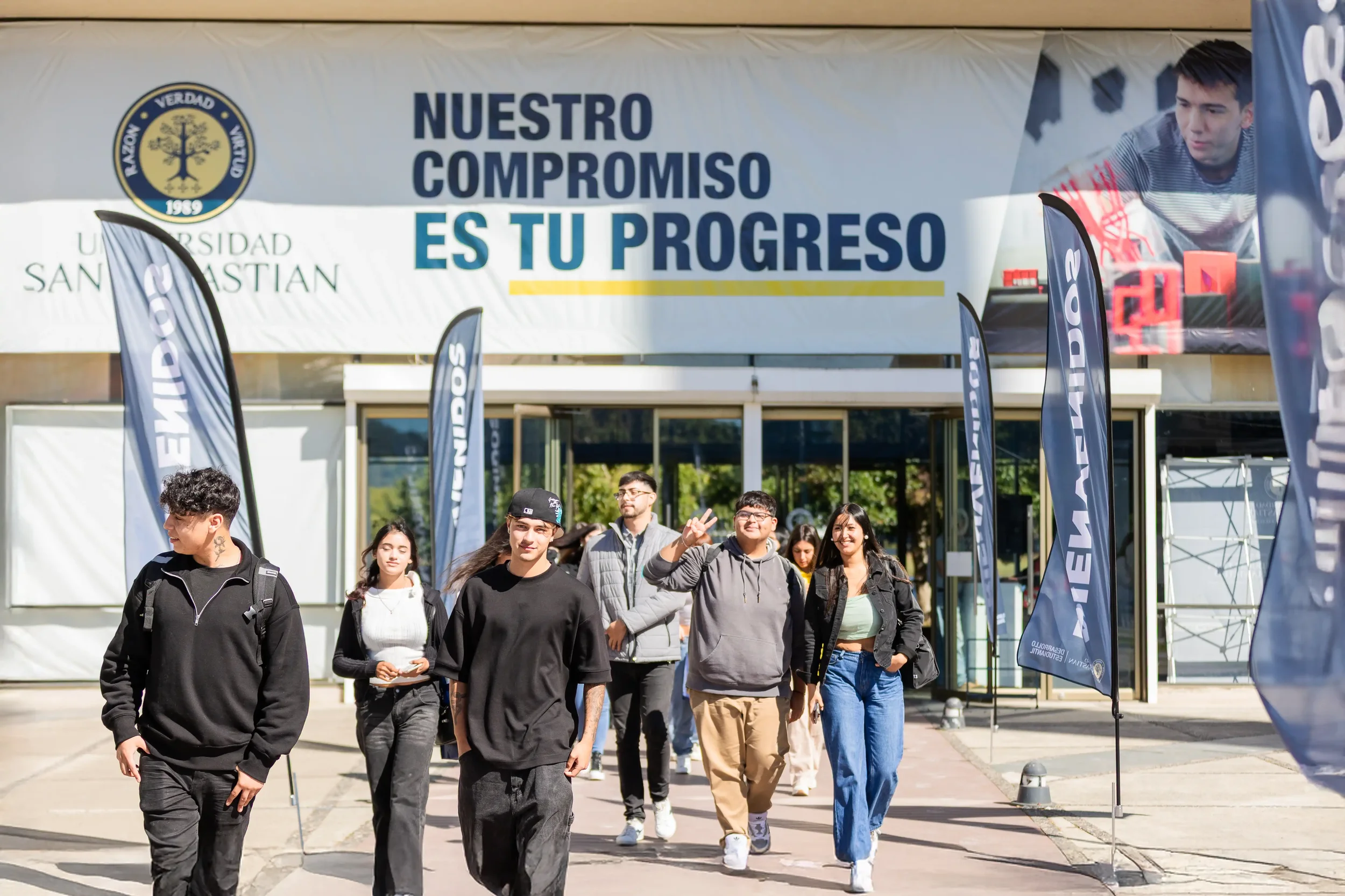 Grupo de estudiantes universitarios caminando en el campus, con un cartel que dice 'Nuestro compromiso es tu progreso' y banderas con los logos de la universidad.