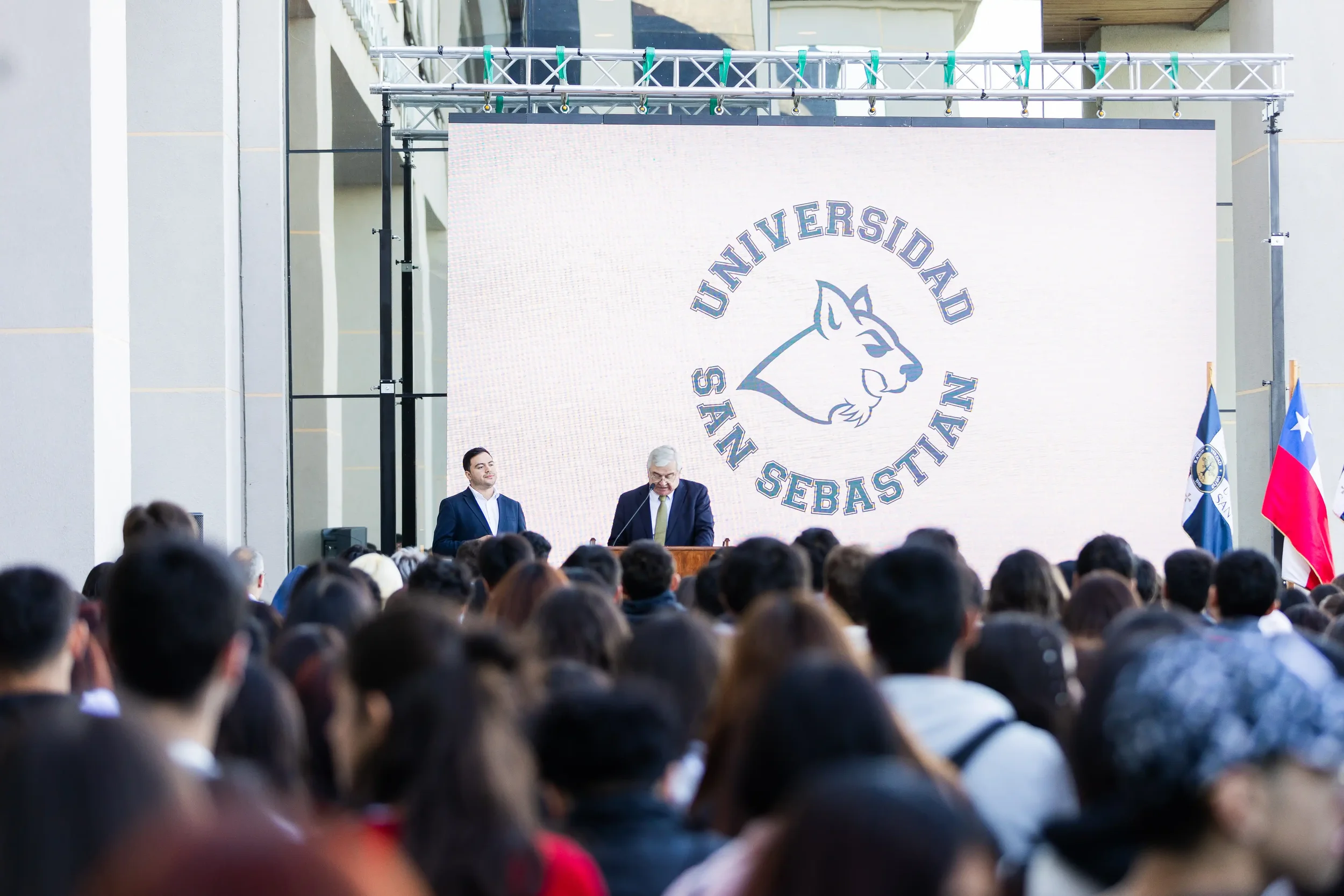 Una ceremonia universitaria en la Universidad San Sebastián con un escenario grande, en el cual hay un logo de un león y las palabras 'Universidad San Sebastián'. En el escenario dos hombres hablan frente a una multitud de estudiantes y profesores.