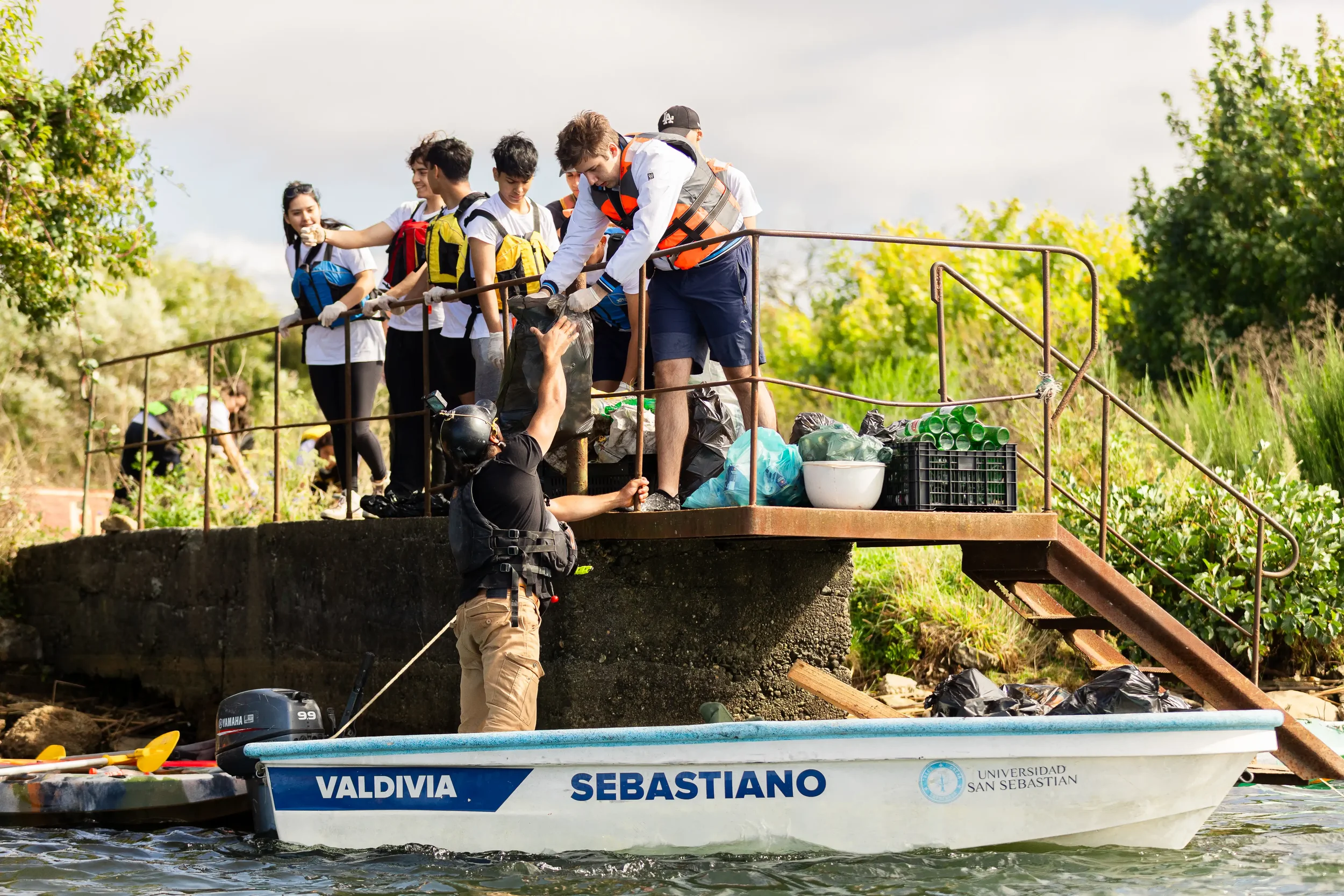 Grupo de jóvenes y un oficial en una lancha, recogiendo basura en un río, con vegetación y árboles al fondo.