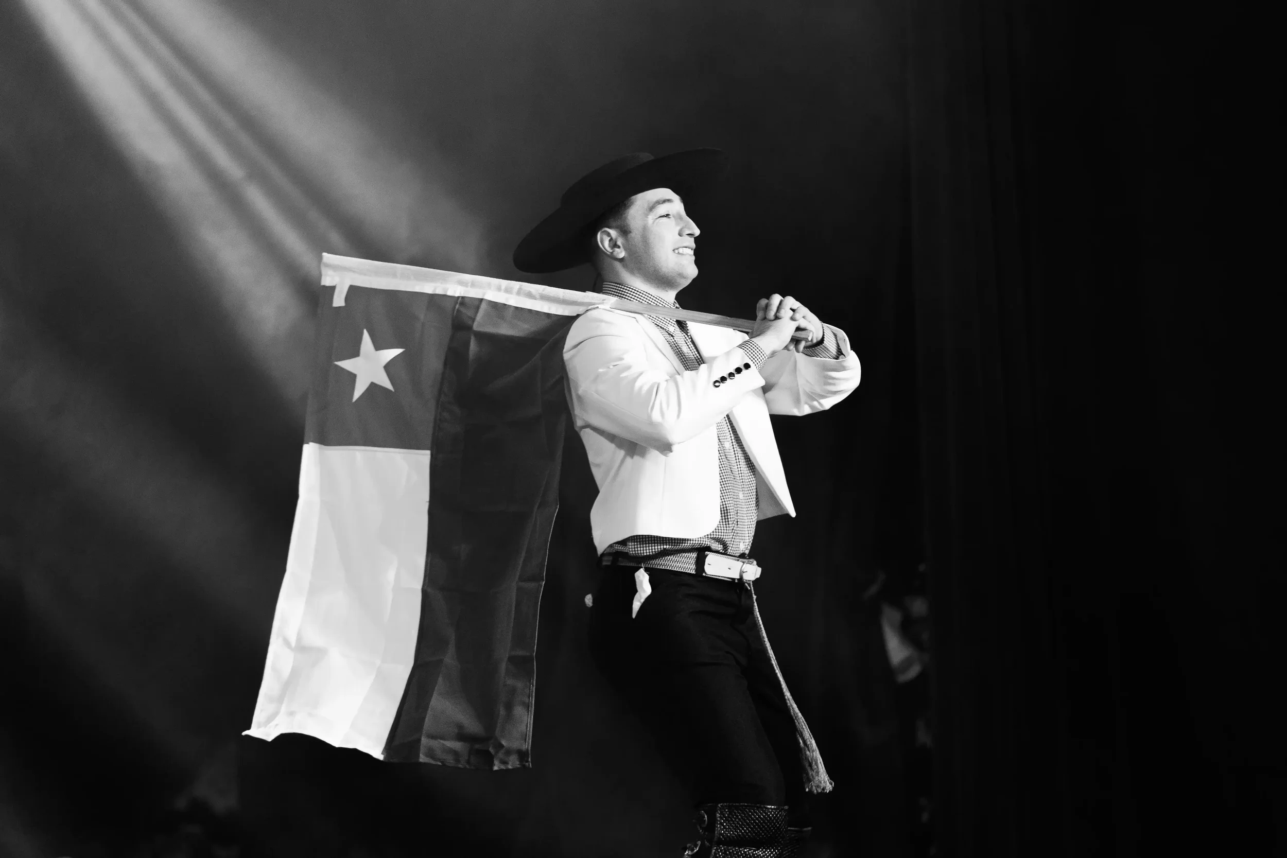 Un hombre con sombrero large y traje elegante sosteniendo una bandera en un escenario con luz enfocada.